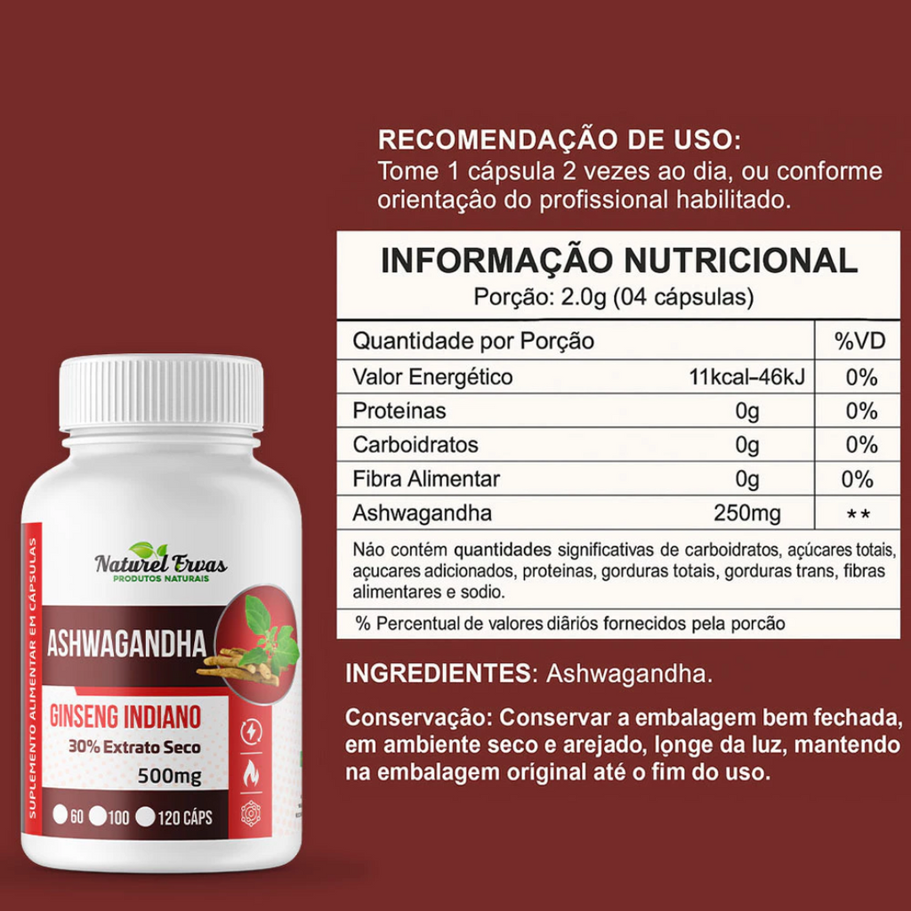🧠 Ashwagandha 500mg – 120 Cápsulas de Equilíbrio, Força e Controle Natural do Estresse